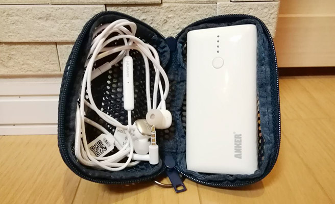 今回は、モバイルバッテリーと、イヤホンを入れてみました。