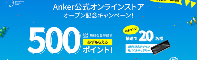 これを記念して、新規会員登録すると500ポイント(500円相当)を必ずもらえるキャンペーンを実施中です。さらに抽選で20名に「アンカー・ジャパン5周年記念デザインバッテリー」が当たるそうです。キャンペーンは2018年6月6日(水)まで。