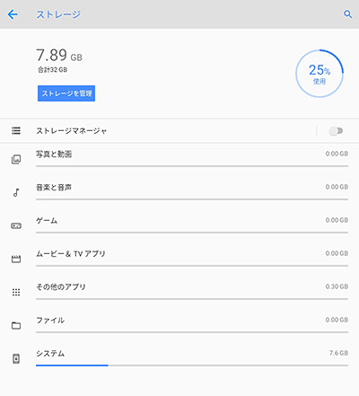 「Lenovo Tab B10 HD」の起動直後のストレージの使用容量は約7.89GBになります。空き容量は24GBくらいしかありませんので、アプリをたくさんインストールする場合、写真や動画をたくさん撮ることが多い場合、音楽や映像などを入れたりすることが多いような場合には、microSDを別途購入して、利用すると安心だと思います。